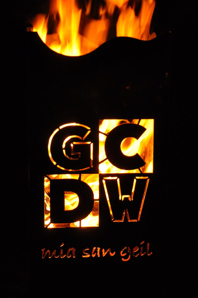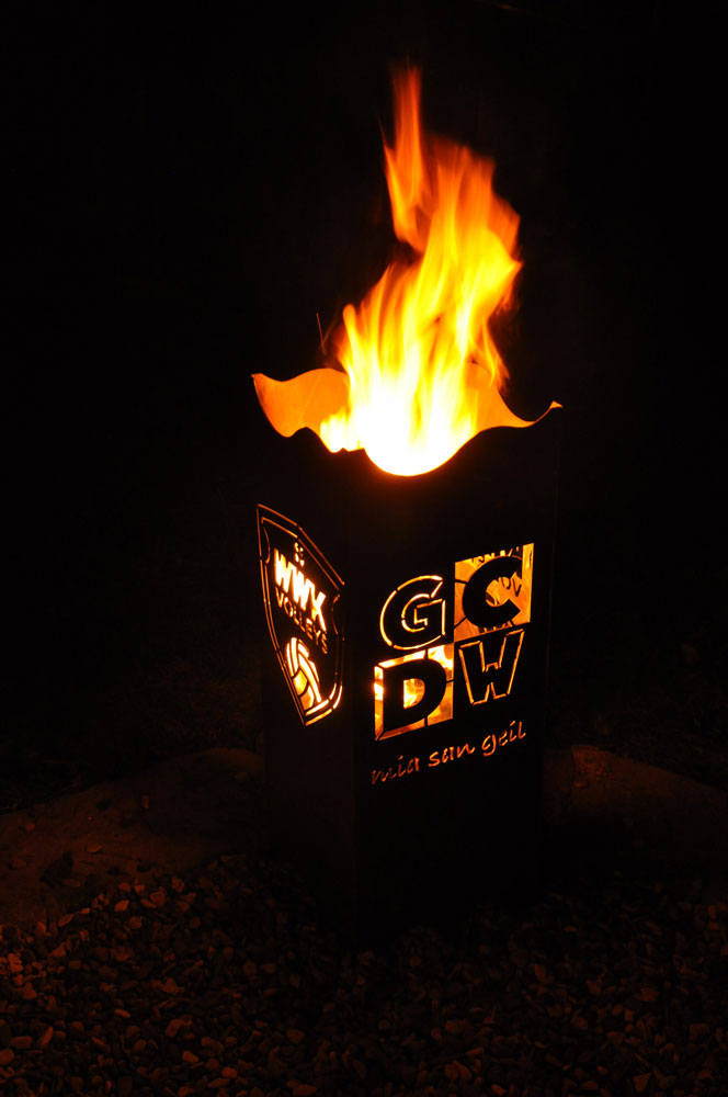 Der Feuerkorb ist aus 3 mm Stahl gefertigt. Das Vereinswappen und Schriftzug werden hochwertig gebrannt und per Hand zu einem Feuerkorb zusammen geschweißt.